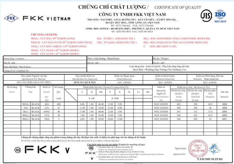 FKK Việt Nam đạt chứng nhận JIS B2311 (chứng nhận tiêu chuẩn Nhật Bản) do tổ chức đảm bảo chất lượng Nhật Bản Japan Quality Assurance Organization (JQA) cấp vào ngày 03/04/2018
