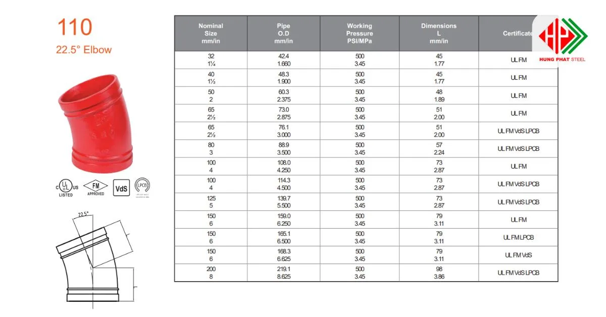 Trong hệ thống ống dẫn nước chữa cháy, cút nối 22.5° được sử dụng để tạo góc chuyển hướng chuẩn, giúp duy trì áp lực nước ổn định và giảm thiểu nguy cơ rò rỉ. Đây là phụ kiện quan trọng đảm bảo hiệu quả hoạt động của hệ thống PCCC trong mọi tình huống.