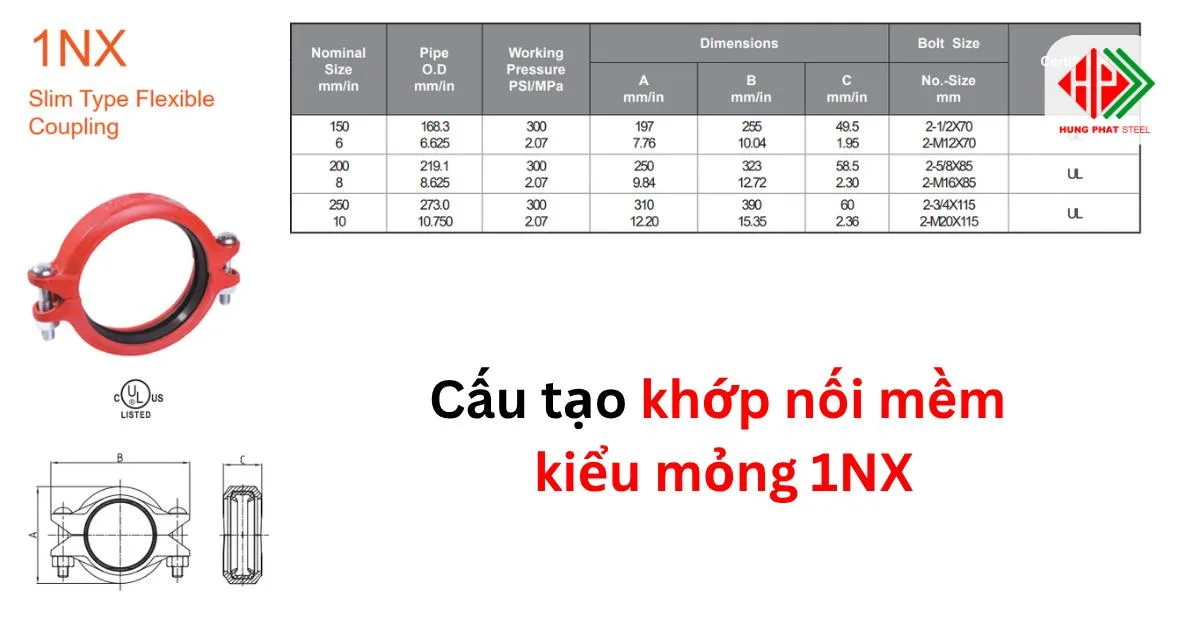 Sản phẩm này được thiết kế với cấu trúc mỏng gọn, dễ lắp đặt, phù hợp với các hệ thống ống có kích thước nhỏ từ 6 inch đến 10 inch. Với khả năng chịu áp lực lên đến 300 PSI (tương đương 2.1 MPa), khớp nối 1NX đáp ứng tốt các yêu cầu kỹ thuật trong hệ thống cấp thoát nước, PCCC, HVAC, xử lý nước và nhiều ứng dụng công nghiệp khác.