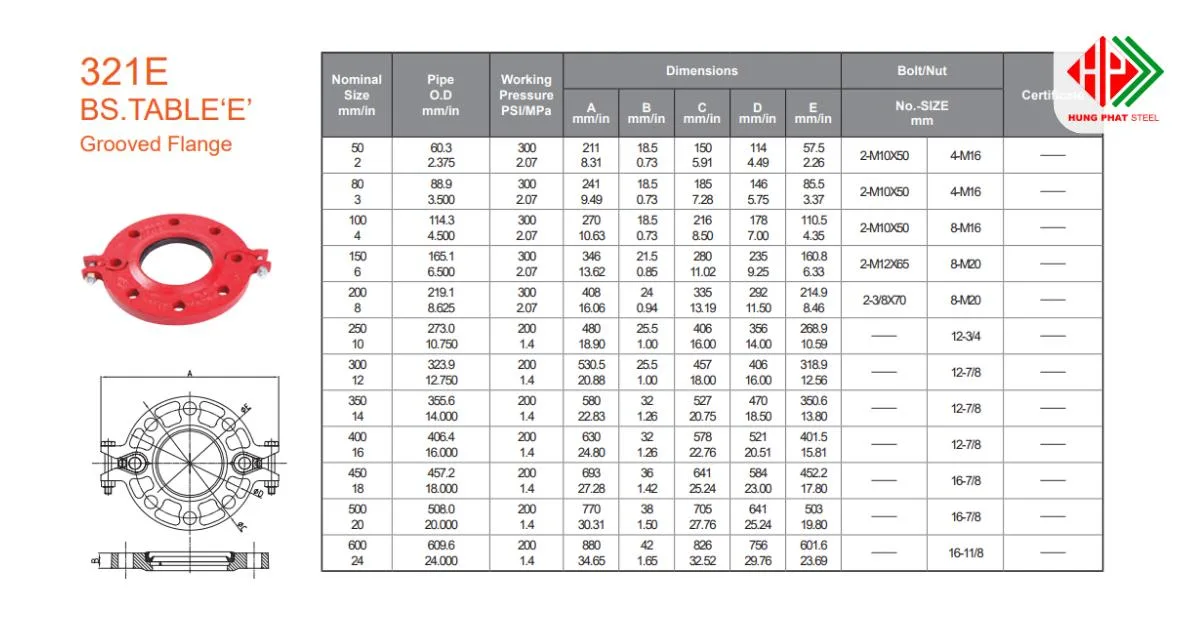 Đây là loại mặt bích rãnh theo tiêu chuẩn BS Table E của Anh Quốc – phù hợp với các hệ thống yêu cầu chuẩn Anh/Châu Âu. Loại này thường được dùng trong các doanh nghiệp có tiêu chuẩn kỹ thuật cao hoặc khi cần đồng bộ với hệ thống theo tiêu chuẩn BS.