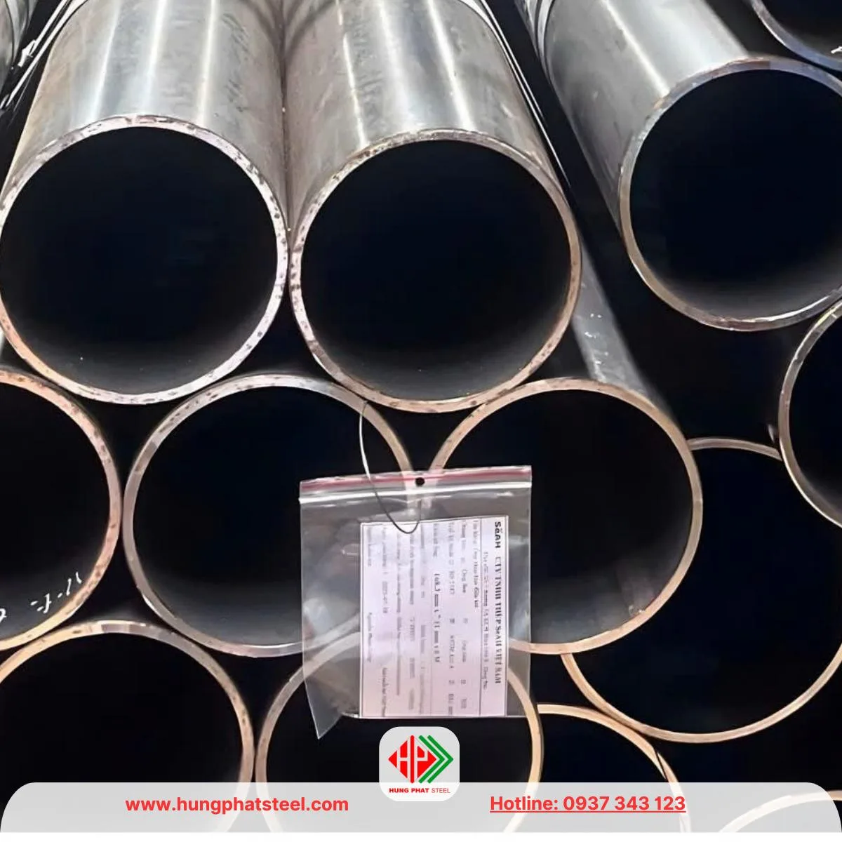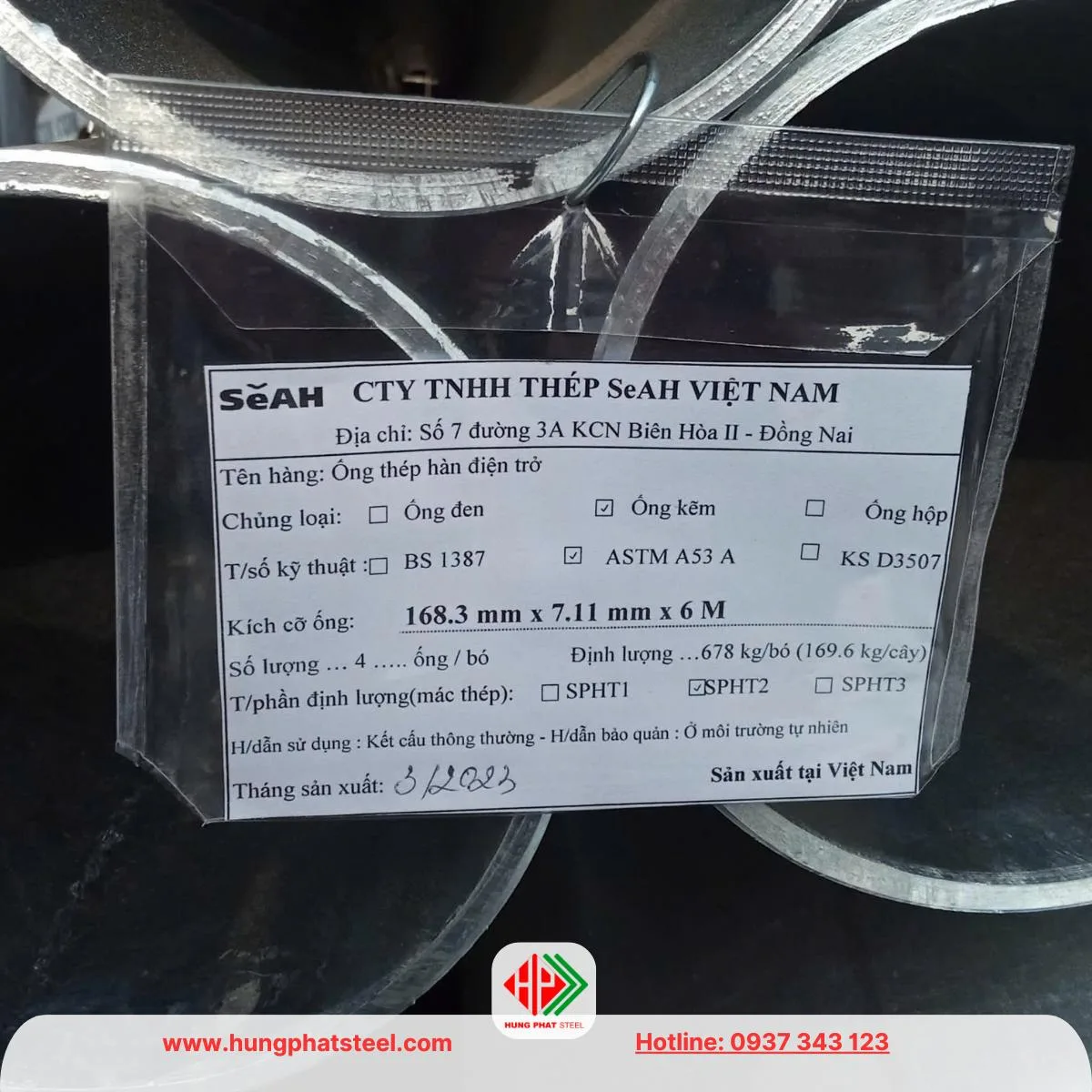 - Ống thép SeAH chính hãng luôn có tem nhãn đi kèm trên mỗi bó hàng hoặc in trực tiếp trên thân ống (tùy lô hàng).