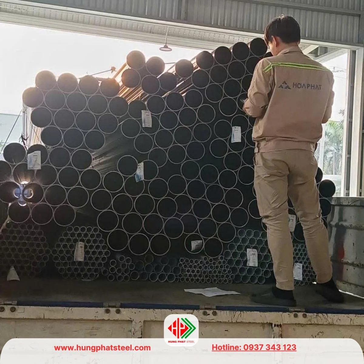 Ống thép Hòa Phát chính hãng thường được đóng bó chắc chắn, có tem nhãn Hòa Phát gắn trực tiếp lên mỗi bó.