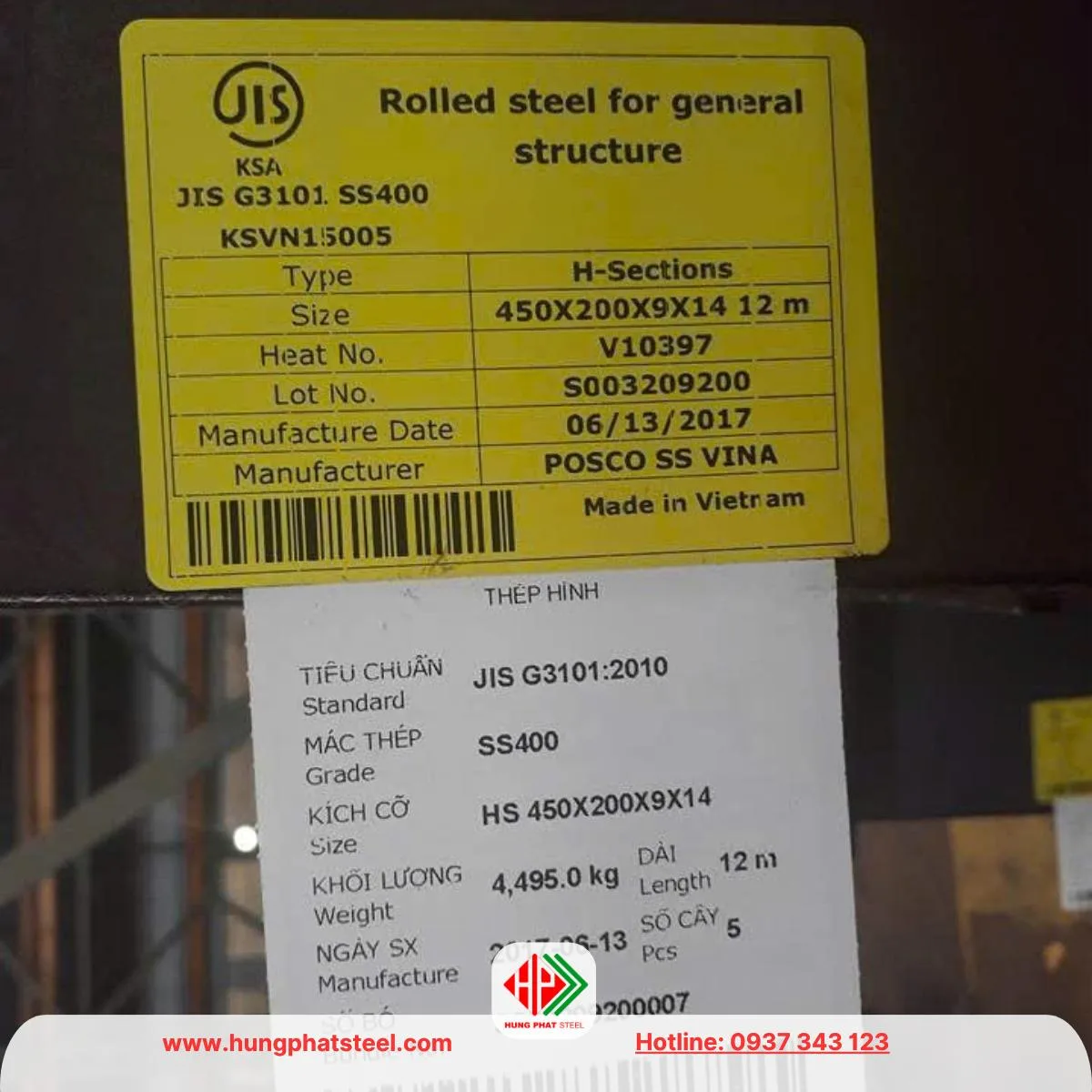 POSCO áp dụng hệ thống kiểm soát chất lượng nghiêm ngặt, đảm bảo thép hình I450 đạt chuẩn quốc tế. Một số mác thép phổ biến gồm SS400, A36, SM490, SM520.