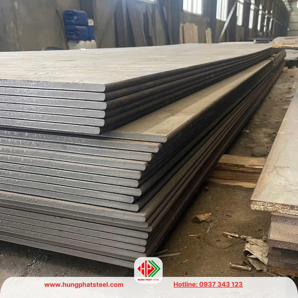 - Kê lên kệ hoặc pallet: Tránh đặt thép tấm trực tiếp trên nền đất để giảm thiểu ảnh hưởng của độ ẩm từ môi trường xung quanh.