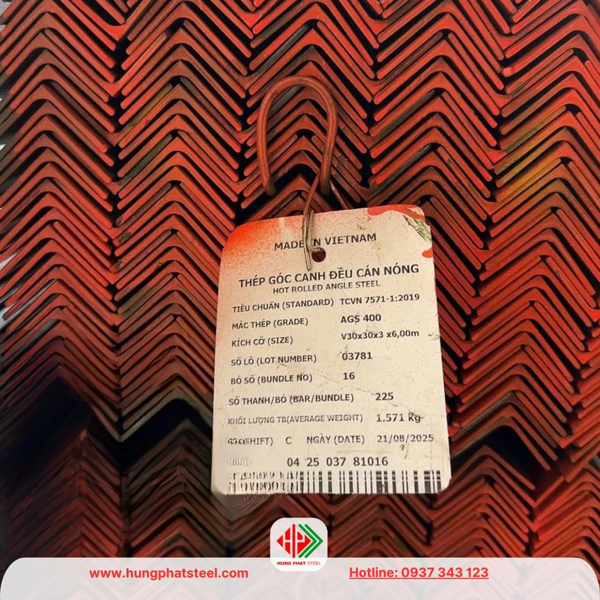 - Mô tả: Đây là loại thép góc đều cạnh cán nóng trực tiếp tại Nhà máy Thép Nhà Bè, có bề mặt màu xám đen tự nhiên hình thành trong quá trình cán ở nhiệt độ cao. Thép V30 đen chưa qua xử lý bề mặt hoặc mạ kẽm, giữ nguyên lớp oxit bảo vệ tự nhiên.