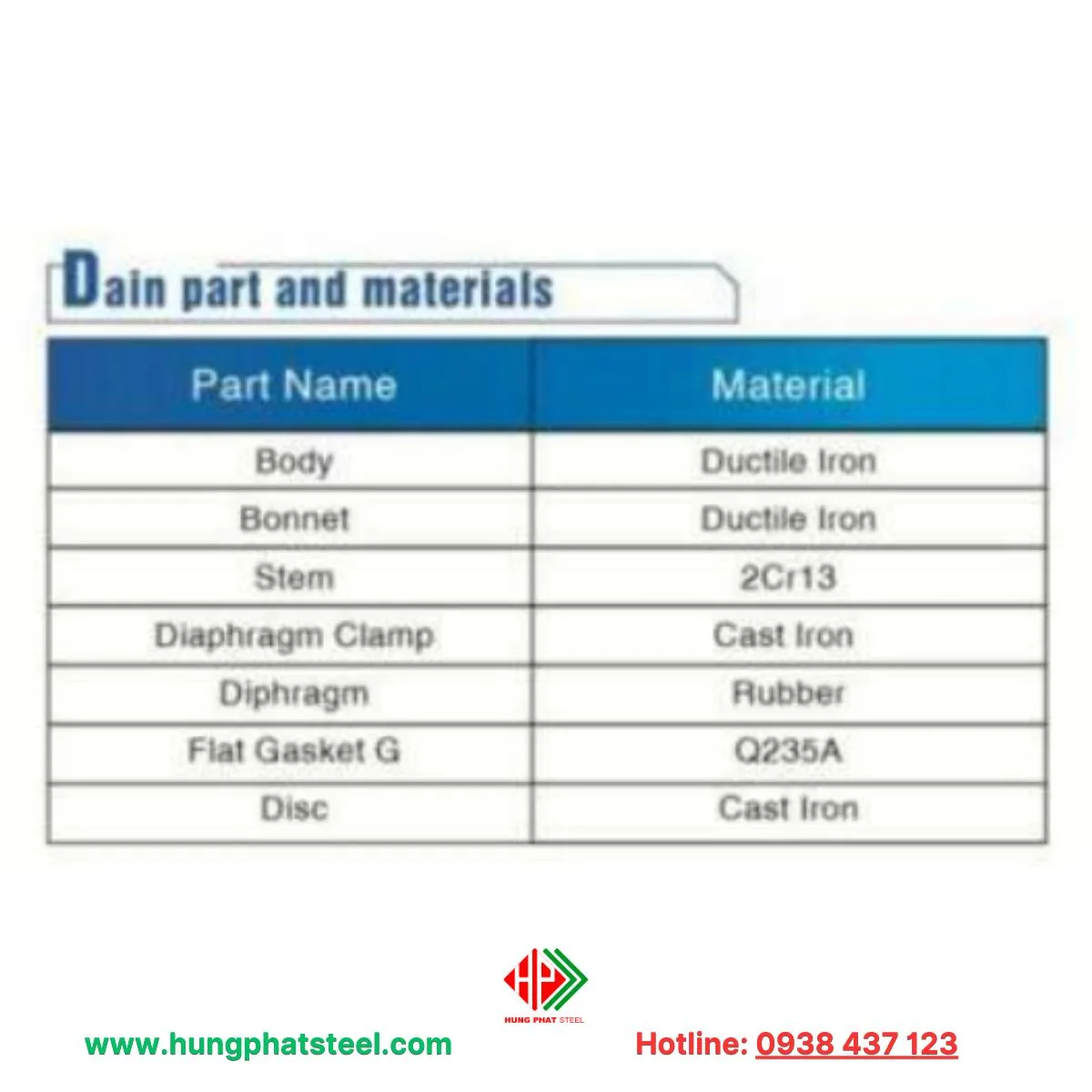 - Màng (Diaphragm): Làm từ cao su (Rubber), đàn hồi tốt, tạo độ kín khi ngăn dòng nước.