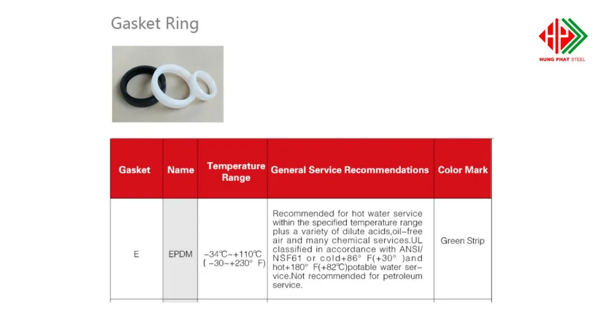 | Gioăng EPDM | E | Nước, nước nóng, PCCC, HVAC, không khí | -34 ~ +110 | 15.000 – 45.000 |